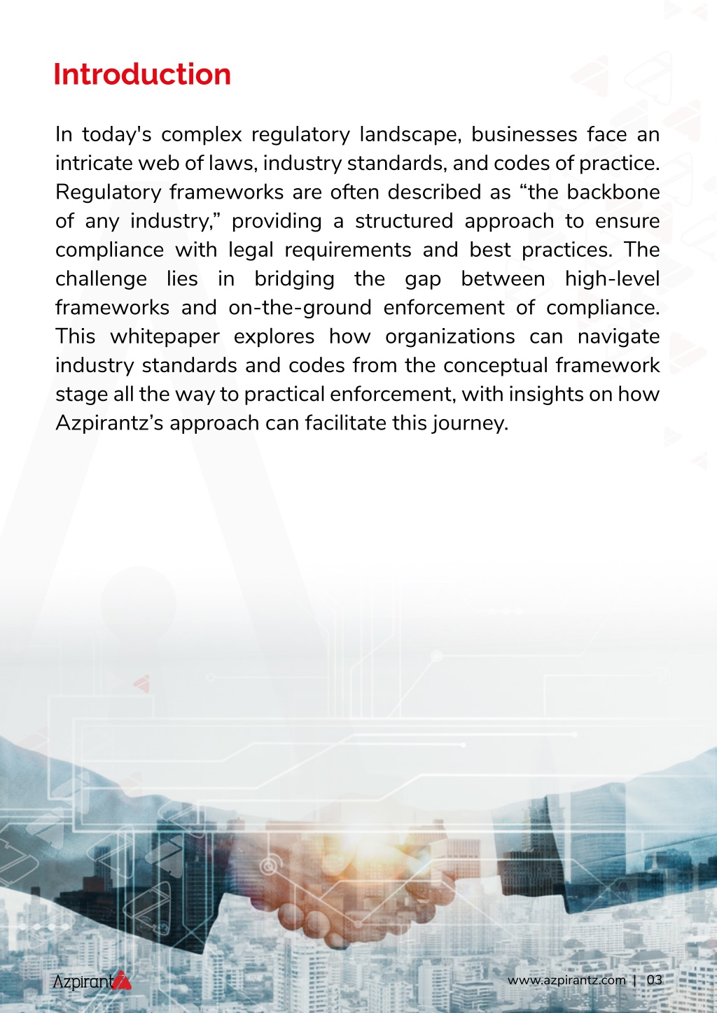 Introduction In today's complex regulatory landscape, businesses face an intricate web of laws, industry standards, and codes of practice. Regulatory frameworks are often described as “the backbone of any industry,” providing a structured approach to ensure compliance with legal requirements and best practices. The challenge lies in bridging the gap between high-level frameworks and on-the-ground enforcement of compliance. This whitepaper explores how organizations can navigate industry standards and codes from the conceptual framework stage all the way to practical enforcement, with insights on how Azpirantz’s approach can facilitate this journey. www.azpirantz.com | 03