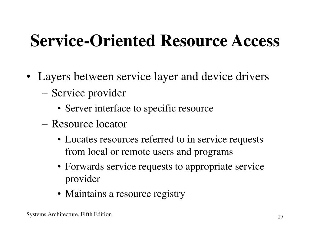 Service-Oriented Resource Access • Layers between service layer and device drivers • Service provider • Server interface to specific resource • Resource locator • Locates resources referred to in service requests from local or remote users and programs • Forwards service requests to appropriate service provider • Maintains a resource registry Systems Architecture, Fifth Edition