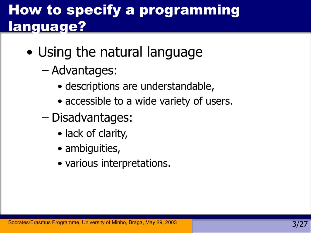 How to specify a programming language? • Using the natural language • Advantages: • descriptions are understandable, • accessible to a wide variety of users. • Disadvantages: • lack of clarity, • ambiguities, • various interpretations.