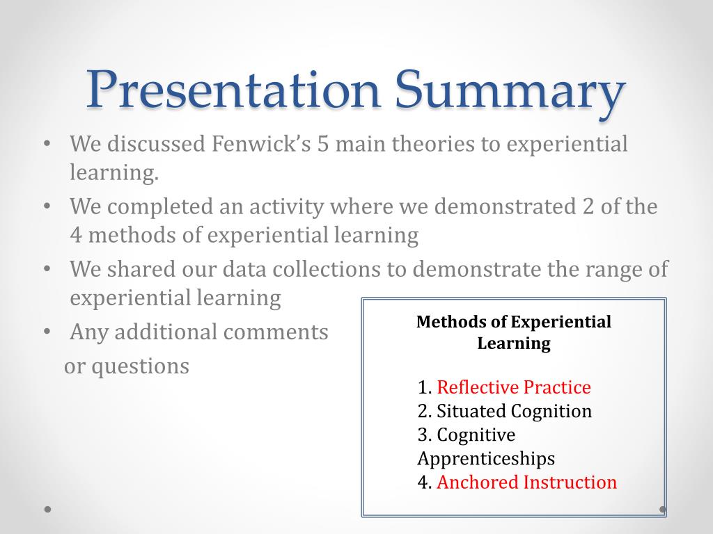 Presentation Summary • We discussed Fenwick’s 5 main theories to experiential learning. • We completed an activity where we demonstrated 2 of the 4 methods of experiential learning • We shared our data collections to demonstrate the range of experiential learning • Any additional comments or questions • Methods of Experiential Learning • 1. Reflective Practice • 2. Situated Cognition • 3. Cognitive Apprenticeships • 4. Anchored Instruction