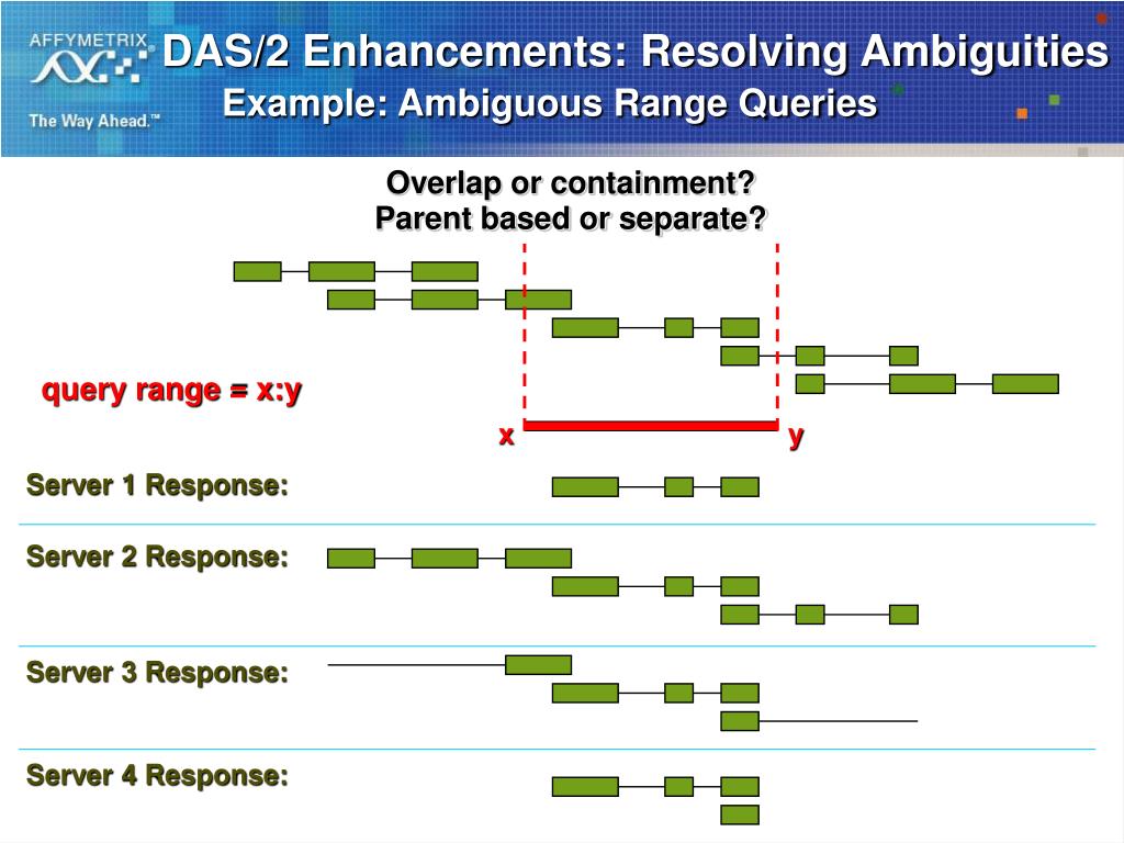 DAS/2 Enhancements: Resolving Ambiguities Example: Ambiguous Range Queries Overlap or containment? Parent based or separate? query range = x:y x y Server 1 Response: Server 2 Response: Server 3 Response: Server 4 Response: