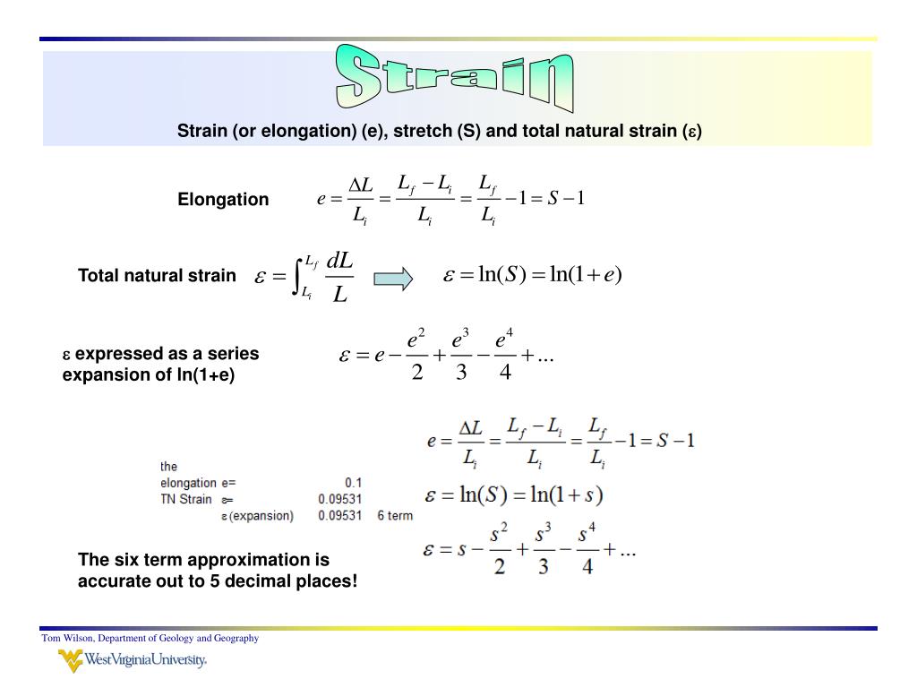 Strain Strain (or elongation) (e), stretch (S) and total natural strain () Elongation Total natural strain expressed as aseries expansion of ln(1+e) The six term approximation is accurate out to 5 decimal places! Tom Wilson, Department of Geology and Geography