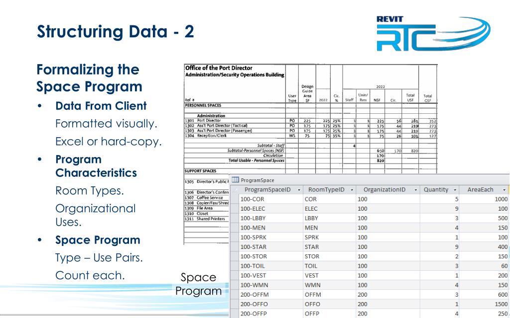 Structuring Data - 2 Formalizing theSpace Program Data From Client Formatted visually. Excel or hard-copy. ProgramCharacteristics Room Types. Organizational Uses. Space Program Type – Use Pairs. Count each. SpaceProgram
