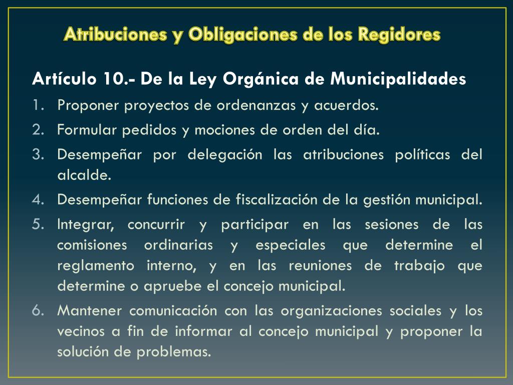 Atribuciones y Obligaciones de los Regidores Artículo 10.- De la Ley Orgánica de Municipalidades • Proponer proyectos de ordenanzas y acuerdos. • Formular pedidos y mociones de orden del día. • Desempeñar por delegación las atribuciones políticas del alcalde. • Desempeñar funciones de fiscalización de la gestión municipal. • Integrar, concurrir y participar en las sesiones de las comisiones ordinarias y especiales que determine el reglamento interno, y en las reuniones de trabajo que determine o apruebe el concejo municipal. • Mantener comunicación con las organizaciones sociales y los vecinos a fin de informar al concejo municipal y proponer la solución de problemas.