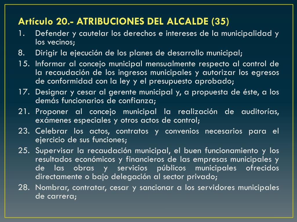 Artículo 20.- ATRIBUCIONES DEL ALCALDE (35) 1. Defender y cautelar los derechos e intereses de la municipalidad y los vecinos; 8. Dirigir la ejecución de los planes de desarrollo municipal; 15. Informar al concejo municipal mensualmente respecto al control de la recaudación de los ingresos municipales y autorizar los egresos de conformidad con la ley y el presupuesto aprobado; 17. Designar y cesar al gerente municipal y, a propuesta de éste, a los demás funcionarios de confianza; 21. Proponer al concejo municipal la realización de auditorías, exámenes especiales y otros actos de control; 23. Celebrar los actos, contratos y convenios necesarios para el ejercicio de sus funciones; 25. Supervisar la recaudación municipal, el buen funcionamiento y los resultados económicos y financieros de las empresas municipales y de las obras y servicios públicos municipales ofrecidos directamente o bajo delegación al sector privado; 28. Nombrar, contratar, cesar y sancionar a los servidores municipales de carrera;