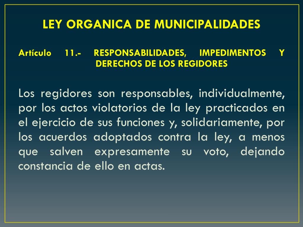 LEY ORGANICA DE MUNICIPALIDADES Artículo 11.- RESPONSABILIDADES, IMPEDIMENTOS Y DERECHOS DE LOS REGIDORES Los regidores son responsables, individualmente, por los actos violatorios de la ley practicados en el ejercicio de sus funciones y, solidariamente, por los acuerdos adoptados contra la ley, a menos que salven expresamente su voto, dejando constancia de ello en actas.