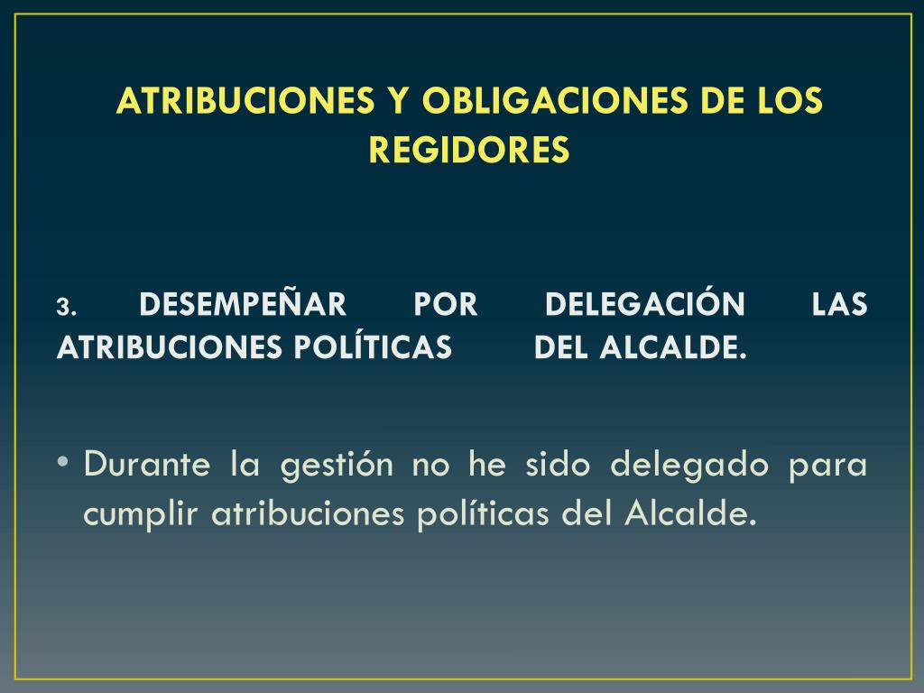 ATRIBUCIONES Y OBLIGACIONES DE LOS REGIDORES 3. DESEMPEÑAR POR DELEGACIÓN LAS ATRIBUCIONES POLÍTICAS DEL ALCALDE. • Durante la gestión no he sido delegado para cumplir atribuciones políticas del Alcalde.