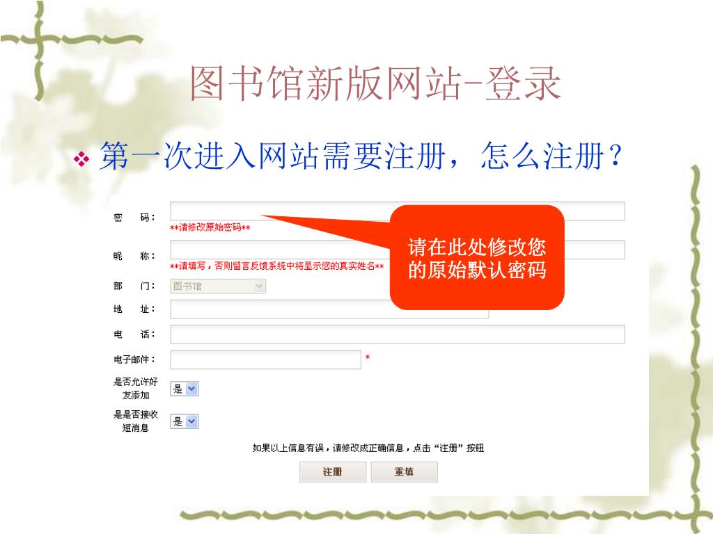 图书馆新版网站-登录 • 第一次进入网站需要注册,怎么注册? 请在此处修改您的原始默认密码