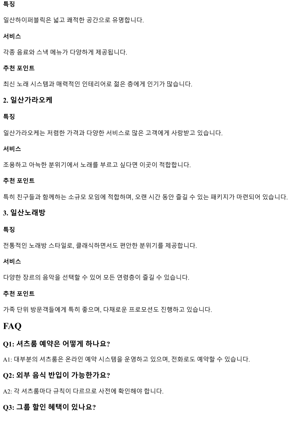 2. 특징 일산하이퍼블릭은넓고쾌적한공간으로유명합니다. 서비스 각종음료와스낵메뉴가다양하게제공됩니다. 추천포인트 최신노래시스템과매력적인인테리어로젊은층에게인기가많습니다. 2. 일산가라오케 특징 일산가라오케는저렴한가격과다양한서비스로많은고객에게사랑받고있습니다. 서비스 조용하고아늑한분위기에서노래를부르고싶다면이곳이적합합니다. 추천포인트 특히친구들과함께하는소규모모임에적합하며, 오랜시간동안즐길수있는패키지가마련되어있습니다. 3. 일산노래방 특징 전통적인노래방스타일로, 클래식하면서도편안한분위기를제공합니다. 서비스 다양한장르의음악을선택할수있어모든연령층이즐길수있습니다. 추천포인트 가족단위방문객들에게특히좋으며, 다채로운프로모션도진행하고있습니다. FAQ Q1: 셔츠룸예약은어떻게하나요? A1: 대부분의셔츠룸은온라인예약시스템을운영하고있으며, 전화로도예약할수있습니다. Q2: 외부음식반입이가능한가요? A2: 각셔츠룸마다규칙이다르므로사전에확인해야합니다. Q3: 그룹할인혜택이있나요?