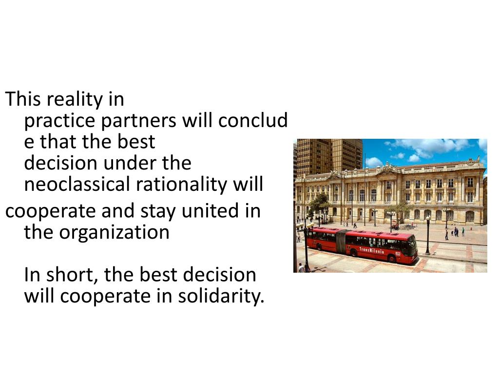This reality in practice partners will conclude that the best decision under the neoclassical rationality will cooperate and stay united in the organizationIn short, the best decision will cooperate in solidarity.