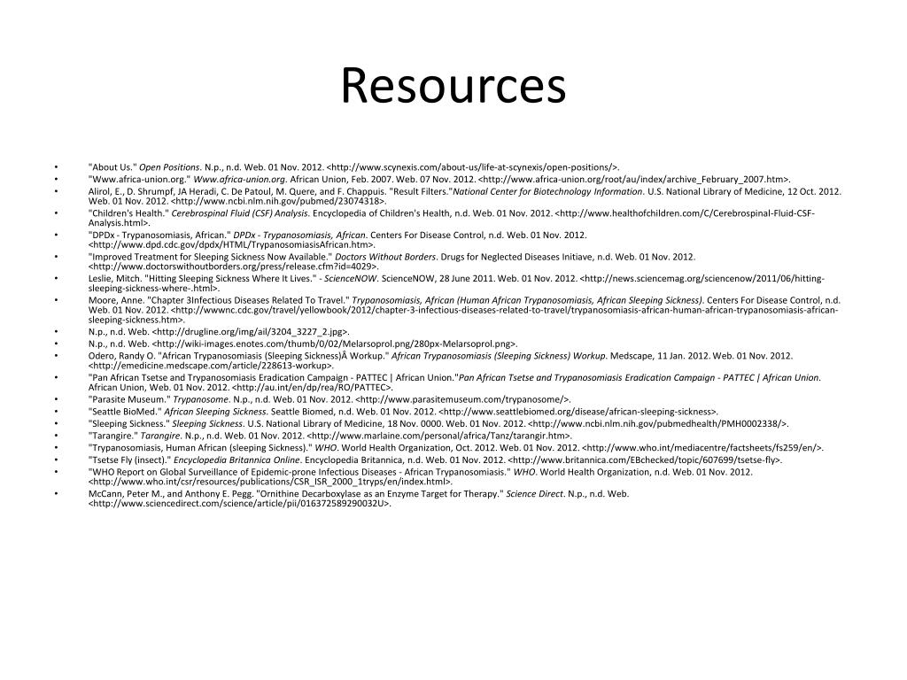 Resources • "About Us." Open Positions. N.p., n.d. Web. 01 Nov. 2012. <http://www.scynexis.com/about-us/life-at-scynexis/open-positions/>. • "Www.africa-union.org." Www.africa-union.org. African Union, Feb. 2007. Web. 07 Nov. 2012. <http://www.africa-union.org/root/au/index/archive_February_2007.htm>. • Alirol, E., D. Shrumpf, JA Heradi, C. De Patoul, M. Quere, and F. Chappuis. "Result Filters."National Center for Biotechnology Information. U.S. National Library of Medicine, 12 Oct. 2012. Web. 01 Nov. 2012. <http://www.ncbi.nlm.nih.gov/pubmed/23074318>. • "Children's Health." Cerebrospinal Fluid (CSF) Analysis. Encyclopedia of Children's Health, n.d. Web. 01 Nov. 2012. <http://www.healthofchildren.com/C/Cerebrospinal-Fluid-CSF-Analysis.html>. • "DPDx - Trypanosomiasis, African." DPDx - Trypanosomiasis, African. Centers For Disease Control, n.d. Web. 01 Nov. 2012. <http://www.dpd.cdc.gov/dpdx/HTML/TrypanosomiasisAfrican.htm>. • "Improved Treatment for Sleeping Sickness Now Available." Doctors Without Borders. Drugs for Neglected Diseases Initiave, n.d. Web. 01 Nov. 2012. <http://www.doctorswithoutborders.org/press/release.cfm?id=4029>. • Leslie, Mitch. "Hitting Sleeping Sickness Where It Lives." - ScienceNOW. ScienceNOW, 28 June 2011. Web. 01 Nov. 2012. <http://news.sciencemag.org/sciencenow/2011/06/hitting-sleeping-sickness-where-.html>. • Moore, Anne. "Chapter 3Infectious Diseases Related To Travel." Trypanosomiasis, African (Human African Trypanosomiasis, African Sleeping Sickness). Centers For Disease Control, n.d. Web. 01 Nov. 2012. <http://wwwnc.cdc.gov/travel/yellowbook/2012/chapter-3-infectious-diseases-related-to-travel/trypanosomiasis-african-human-african-trypanosomiasis-african-sleeping-sickness.htm>. • N.p., n.d. Web. <http://drugline.org/img/ail/3204_3227_2.jpg>. • N.p., n.d. Web. <http://wiki-images.enotes.com/thumb/0/02/Melarsoprol.png/280px-Melarsoprol.png>. • Odero, Randy O. "African Trypanosomiasis (Sleeping Sickness)Â Workup." African Trypanosomiasis (Sleeping Sickness) Workup. Medscape, 11 Jan. 2012. Web. 01 Nov. 2012. <http://emedicine.medscape.com/article/228613-workup>. • "Pan African Tsetse and Trypanosomiasis Eradication Campaign - PATTEC | African Union."Pan African Tsetse and Trypanosomiasis Eradication Campaign - PATTEC | African Union. African Union, Web. 01 Nov. 2012. <http://au.int/en/dp/rea/RO/PATTEC>. • "Parasite Museum." Trypanosome. N.p., n.d. Web. 01 Nov. 2012. <http://www.parasitemuseum.com/trypanosome/>. • "Seattle BioMed." African Sleeping Sickness. Seattle Biomed, n.d. Web. 01 Nov. 2012. <http://www.seattlebiomed.org/disease/african-sleeping-sickness>. • "Sleeping Sickness." Sleeping Sickness. U.S. National Library of Medicine, 18 Nov. 0000. Web. 01 Nov. 2012. <http://www.ncbi.nlm.nih.gov/pubmedhealth/PMH0002338/>. • "Tarangire." Tarangire. N.p., n.d. Web. 01 Nov. 2012. <http://www.marlaine.com/personal/africa/Tanz/tarangir.htm>. • "Trypanosomiasis, Human African (sleeping Sickness)." WHO. World Health Organization, Oct. 2012. Web. 01 Nov. 2012. <http://www.who.int/mediacentre/factsheets/fs259/en/>. • "Tsetse Fly (insect)." Encyclopedia Britannica Online. Encyclopedia Britannica, n.d. Web. 01 Nov. 2012. <http://www.britannica.com/EBchecked/topic/607699/tsetse-fly>. • "WHO Report on Global Surveillance of Epidemic-prone Infectious Diseases - African Trypanosomiasis." WHO. World Health Organization, n.d. Web. 01 Nov. 2012. <http://www.who.int/csr/resources/publications/CSR_ISR_2000_1tryps/en/index.html>. • McCann, Peter M., and Anthony E. Pegg. "Ornithine Decarboxylase as an Enzyme Target for Therapy." Science Direct. N.p., n.d. Web. <http://www.sciencedirect.com/science/article/pii/016372589290032U>.