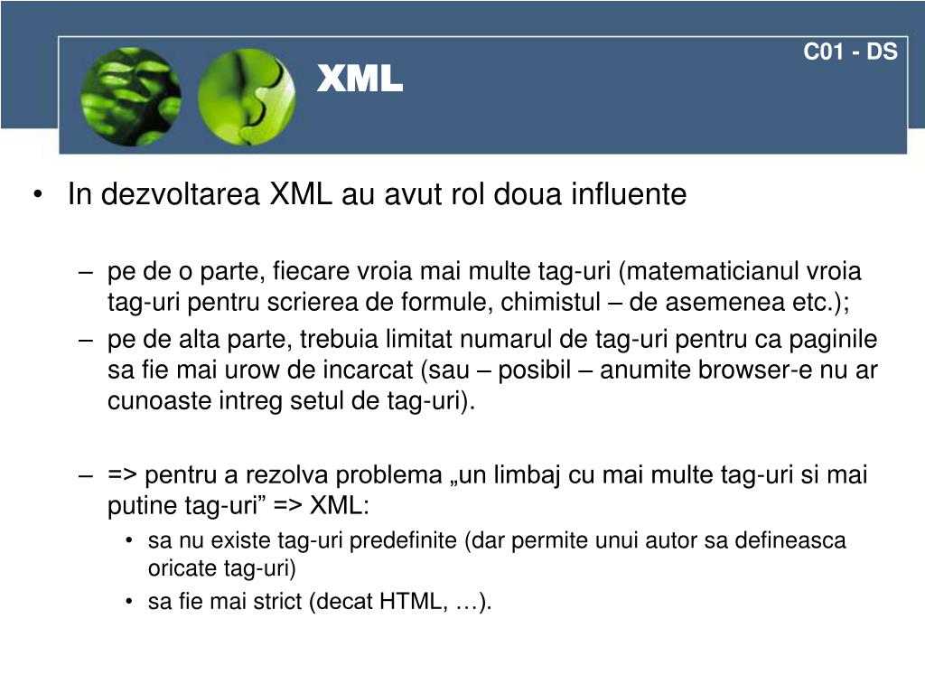 C01 - DS XML • In dezvoltarea XML au avut rol doua influente • pe de o parte, fiecare vroia mai multe tag-uri (matematicianul vroia tag-uri pentru scrierea de formule, chimistul – de asemenea etc.); • pe de alta parte, trebuia limitat numarul de tag-uri pentru ca paginile sa fie mai urow de incarcat (sau – posibil – anumite browser-e nu ar cunoaste intreg setul de tag-uri). • => pentru a rezolva problema „un limbaj cu mai multe tag-uri si mai putine tag-uri” => XML: • sa nu existe tag-uri predefinite (dar permite unui autor sa defineasca oricate tag-uri) • sa fie mai strict (decat HTML, …).