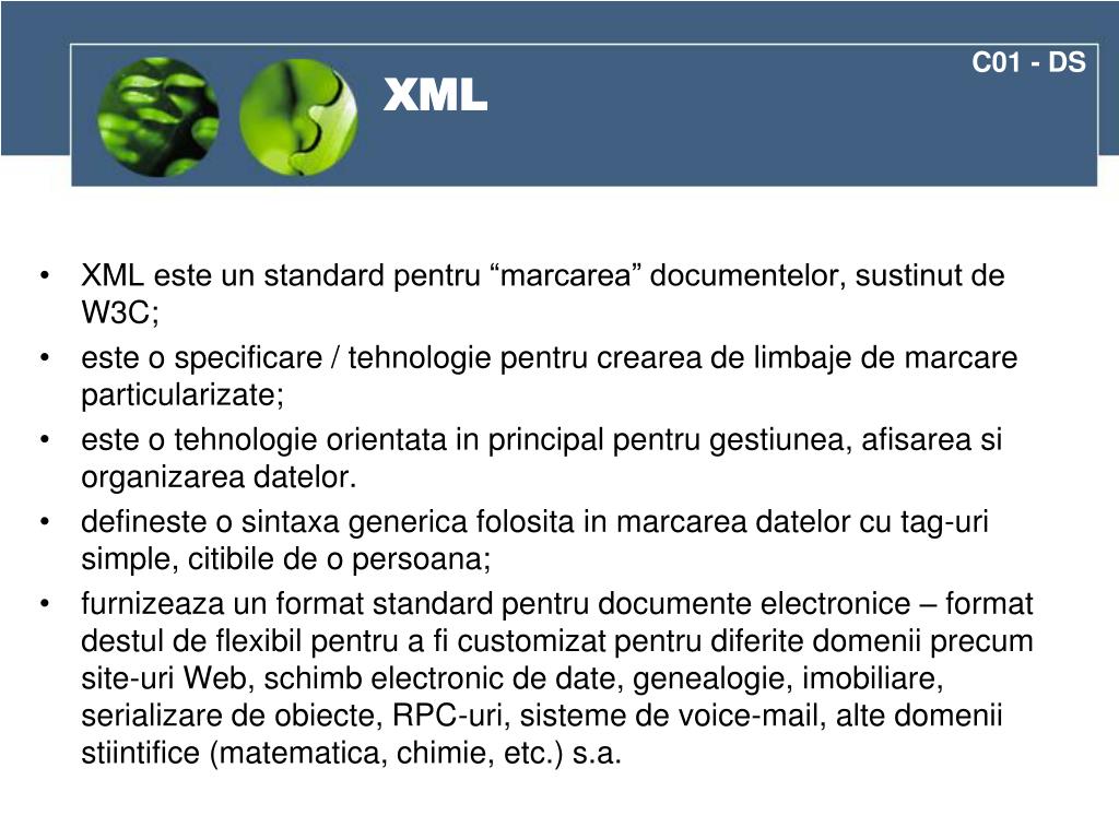 C01 - DS XML • XML este un standard pentru “marcarea” documentelor, sustinut de W3C; • este o specificare / tehnologie pentru crearea de limbaje de marcare particularizate; • este o tehnologie orientata in principal pentru gestiunea, afisarea si organizarea datelor. • defineste o sintaxa generica folosita in marcarea datelor cu tag-uri simple, citibile de o persoana; • furnizeaza un format standard pentru documente electronice – format destul de flexibil pentru a fi customizat pentru diferite domenii precum site-uri Web, schimb electronic de date, genealogie, imobiliare, serializare de obiecte, RPC-uri, sisteme de voice-mail, alte domenii stiintifice (matematica, chimie, etc.) s.a.