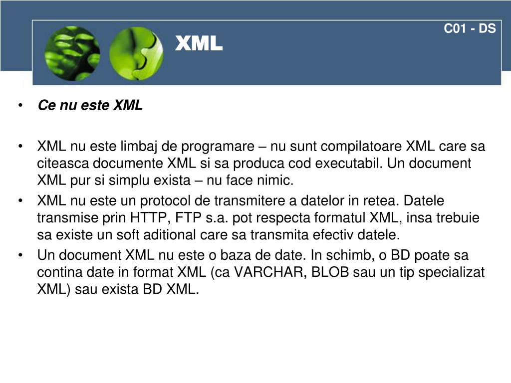 C01 - DS XML • Ce nu este XML • XML nu este limbaj de programare – nu sunt compilatoare XML care sa citeasca documente XML si sa produca cod executabil. Un document XML pur si simplu exista – nu face nimic. • XML nu este un protocol de transmitere a datelor in retea. Datele transmise prin HTTP, FTP s.a. pot respecta formatul XML, insa trebuie sa existe un soft aditional care sa transmita efectiv datele. • Un document XML nu este o baza de date. In schimb, o BD poate sa contina date in format XML (ca VARCHAR, BLOB sau un tip specializat XML) sau exista BD XML.