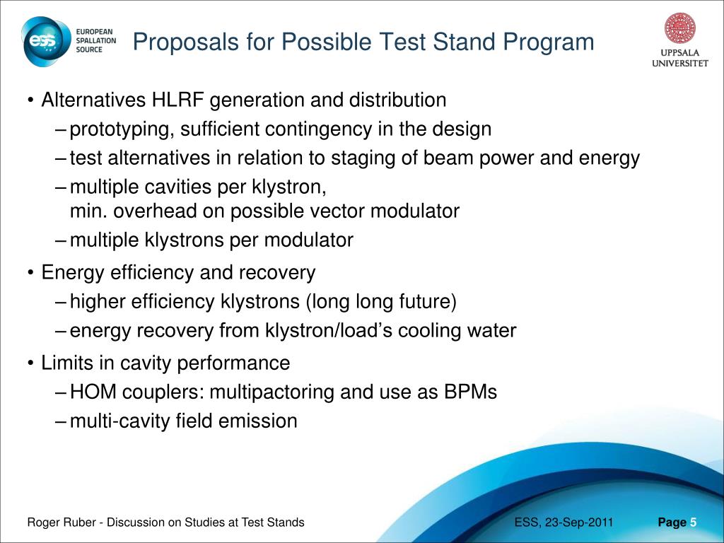 FREIA: RF and Cryogenic Facilities • Test Facility at Uppsala University • prototyping of LLRF and HLRF solutions • training of students and staff • 4 Years development phase • 2011 – 2012: design, tendering • 2013 – 2014: commissioning, R&D RF systems (components & concepts) • 2015 and beyond: energy efficiency, component testing • Hardware: • HV pulse modulator • 704 MHz klystron (1.5 MW) • RF distribution system • LLRF system • 2 SRF elliptical cavities • helium liquefier Roger Ruber - Discussion on Studies at Test Stands