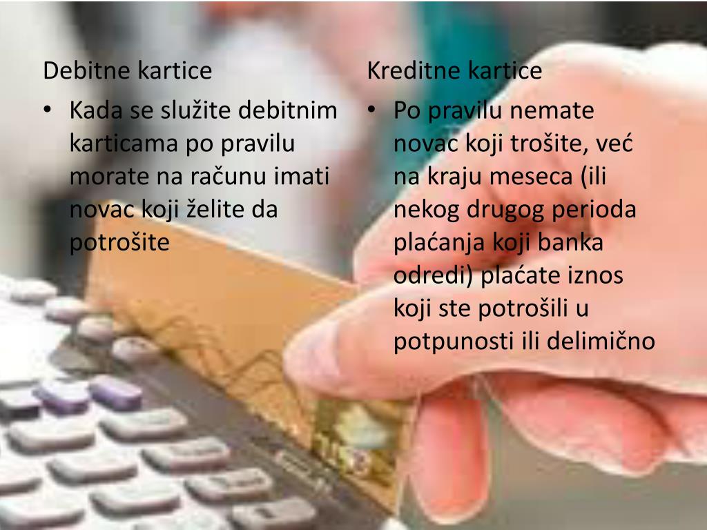 Debitne kartice • Kada se služite debitnimkarticamapopravilumoratenaračunuimatinovackojiželitedapotrošite Kreditne kartice • Po pravilunematenovackojitrošite, većnakrajumeseca (ilinekogdrugogperiodaplaćanjakojibankaodredi) plaćateiznoskojistepotrošili u potpunostiilidelimično