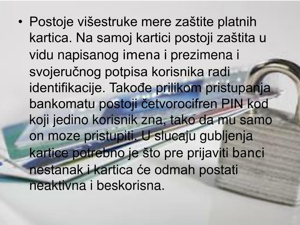 Postoje višestruke mere zaštite platnih kartica. Na samoj kartici postoji zaštita u vidu napisanog imena i prezimena i svojeručnog potpisa korisnika radi identifikacije. Takođe prilikom pristupanja bankomatu postoji četvorocifren PIN kod koji jedino korisnik zna, tako da mu samo on moze pristupiti. U slucaju gubljenja kartice potrebno je što pre prijaviti bancinestanak i kartica će odmah postati neaktivna i beskorisna.