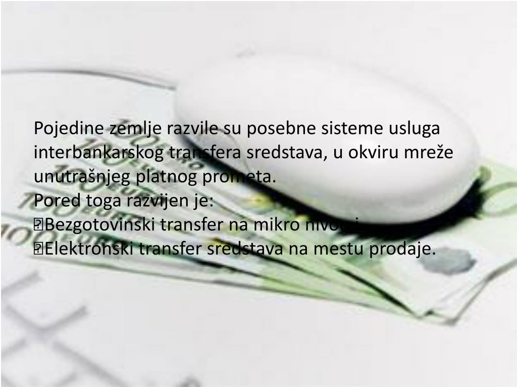 Pojedinezemljerazvilesuposebnesistemeuslugainterbankarskogtransferasredstava, uokvirumrežeunutrašnjegplatnogprometa. Pored toga razvijen je:- Bezgotovinski transfer namikronivoui- Elektronski transfer sredstavanamestuprodaje.