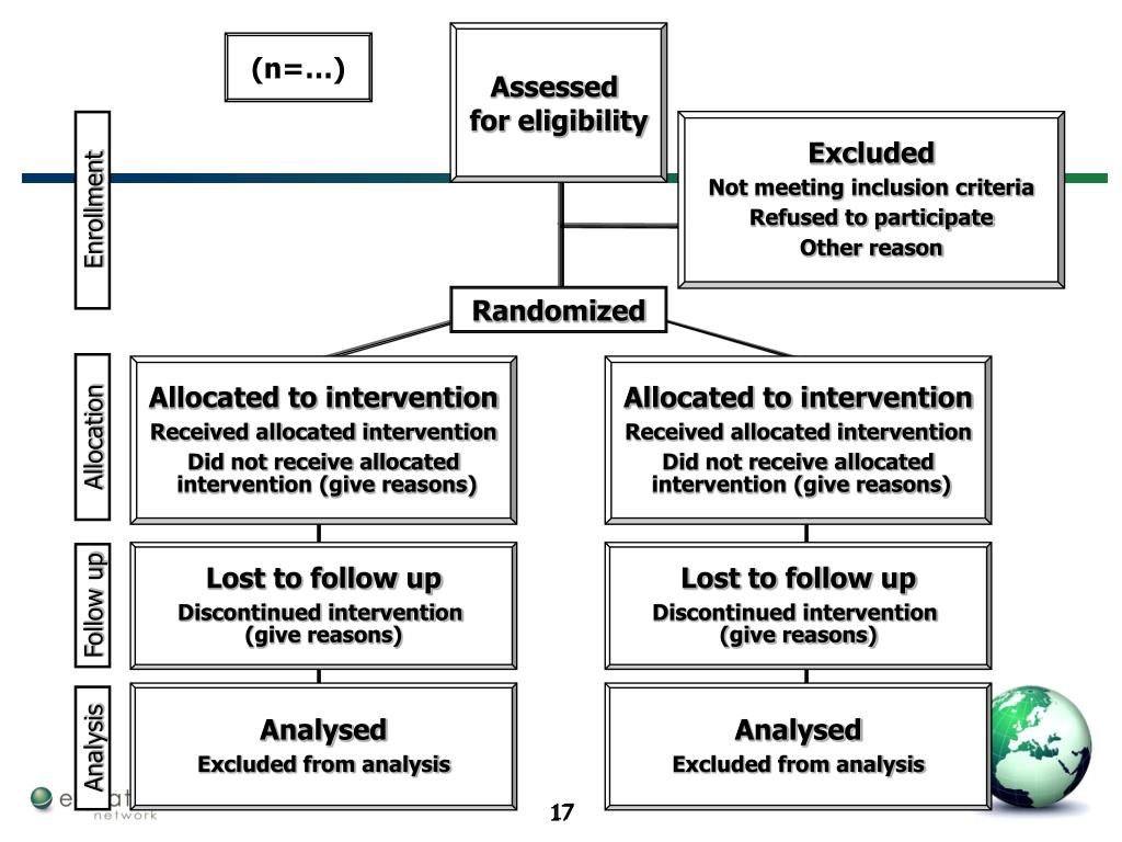 Excluded Not meeting inclusion criteria Refused to participate Other reason Enrollment Randomized Allocated to intervention Received allocated intervention Did not receive allocated intervention (give reasons) Allocated to intervention Received allocated intervention Did not receive allocated intervention (give reasons) Allocation Lost to follow up Discontinued intervention (give reasons) Lost to follow up Discontinued intervention (give reasons) Follow up Analysed Excluded from analysis Analysed Excluded from analysis Analysis Assessed for eligibility (n=…) 17