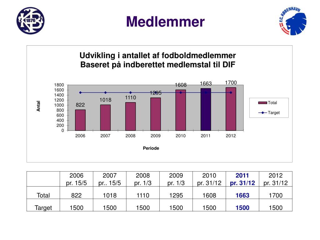 Medlemmer • Fordelingen af medlemmer ultimo 2011 (2010) … • 0-12 år: 846 (825) • 13-18 år: 383 (411) • 19-24 år: 96 (119) • 25-60 år: 273 (213) • Over 60 år: 65 (40) • Vækst i medlemmer fra 2006 til 2011 er på +100% • I gennemsnit ligger fodbold på ca. 1500 medlemmer • +4000 aktive spillere på Frb. - i 2004 var der 2000 • Medlemskort / Parkeringsordning samt ’spillerlister’