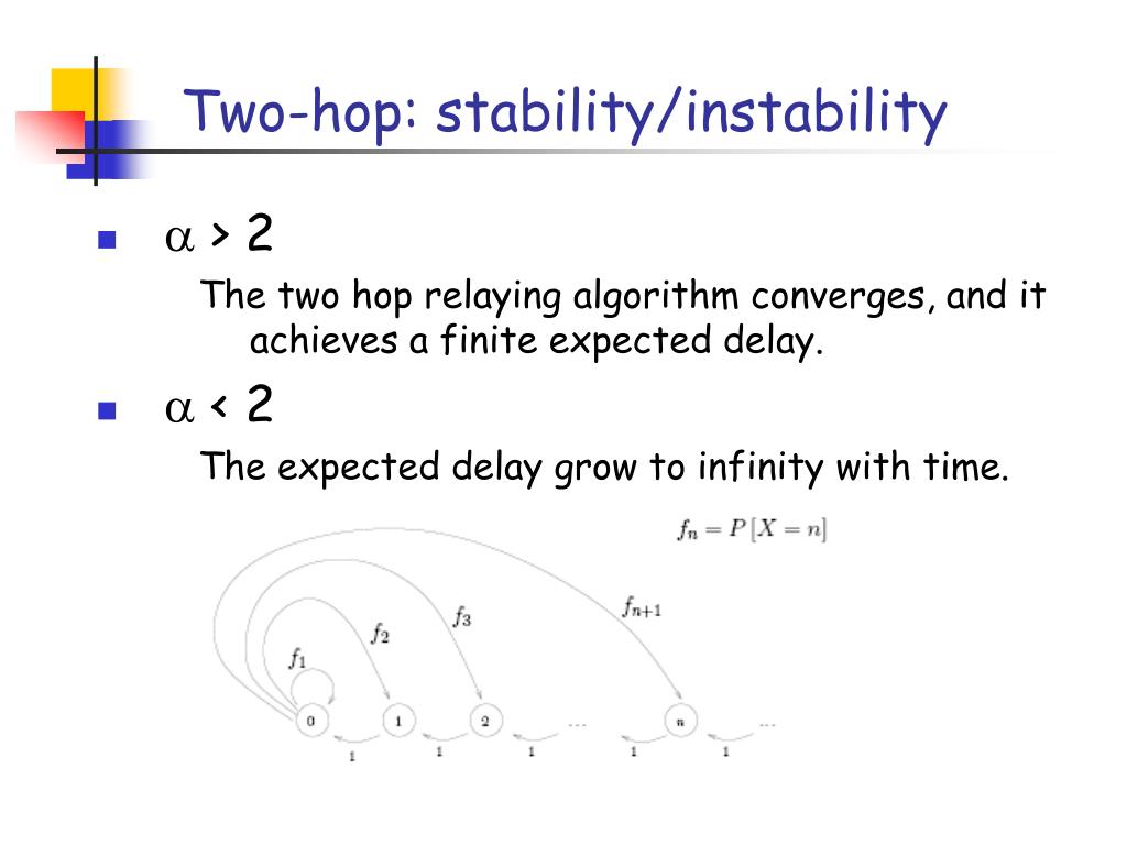 Two-hop: stability/instability • a > 2 The two hop relaying algorithm converges, and it achieves a finite expected delay. • a < 2 The expected delay grow to infinity with time.