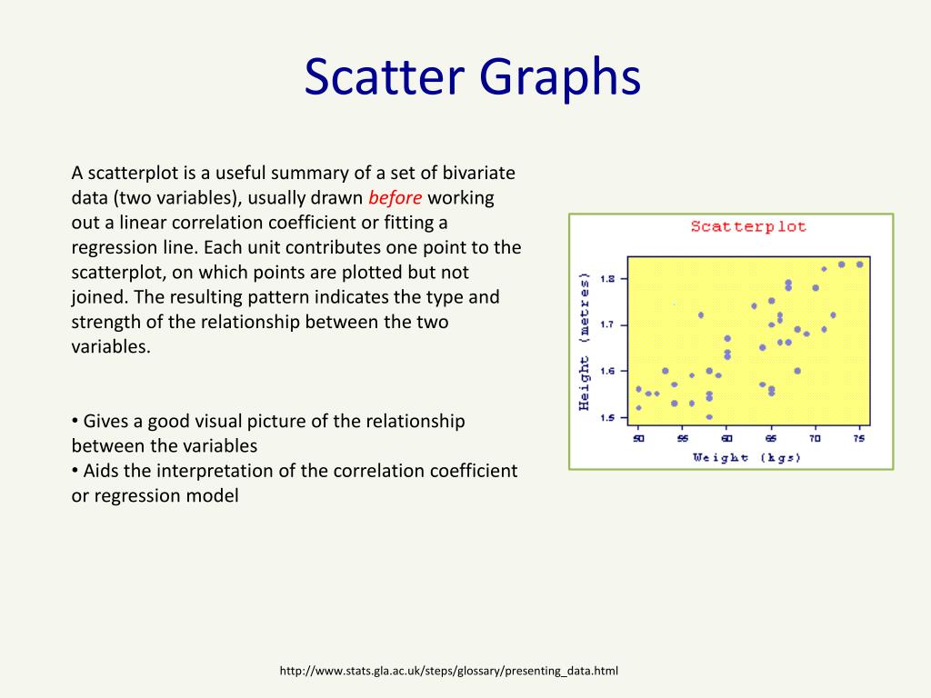 Scatter Graphs • A scatterplot is a useful summary of a set of bivariate data (two variables), usually drawn before working out a linear correlation coefficient or fitting a regression line. Each unit contributes one point to the scatterplot, on which points are plotted but not joined. The resulting pattern indicates the type and strength of the relationship between the two variables. • Gives a good visual picture of the relationship between the variables • Aids the interpretation of the correlation coefficient or regression model http://www.stats.gla.ac.uk/steps/glossary/presenting_data.html