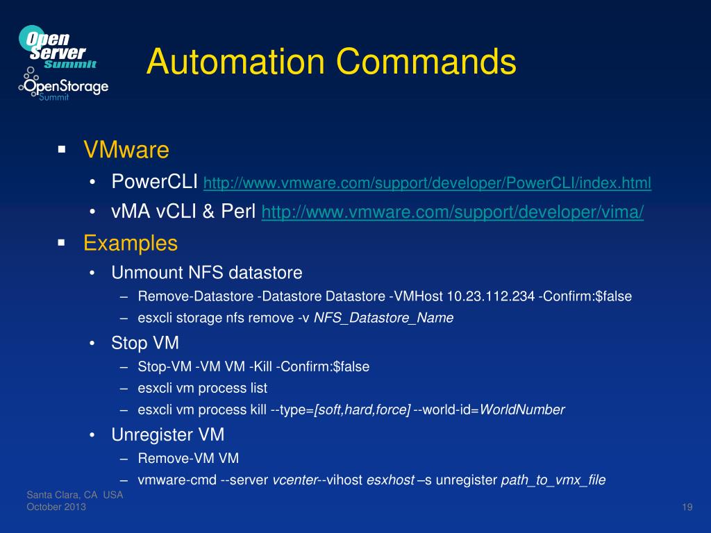 Automation Commands • VMware • PowerCLIhttp://www.vmware.com/support/developer/PowerCLI/index.html • vMAvCLI & Perl http://www.vmware.com/support/developer/vima/ • Examples • Unmount NFS datastore • Remove-Datastore -Datastore Datastore -VMHost 10.23.112.234 -Confirm:$false • esxcli storage nfs remove -v NFS_Datastore_Name • Stop VM • Stop-VM -VM VM -Kill -Confirm:$false • esxclivm process list • esxclivm process kill --type=[soft,hard,force] --world-id=WorldNumber • Unregister VM • Remove-VM VM • vmware-cmd --server vcenter--vihostesxhost –s unregister path_to_vmx_file Santa Clara, CA USA October 2013 19