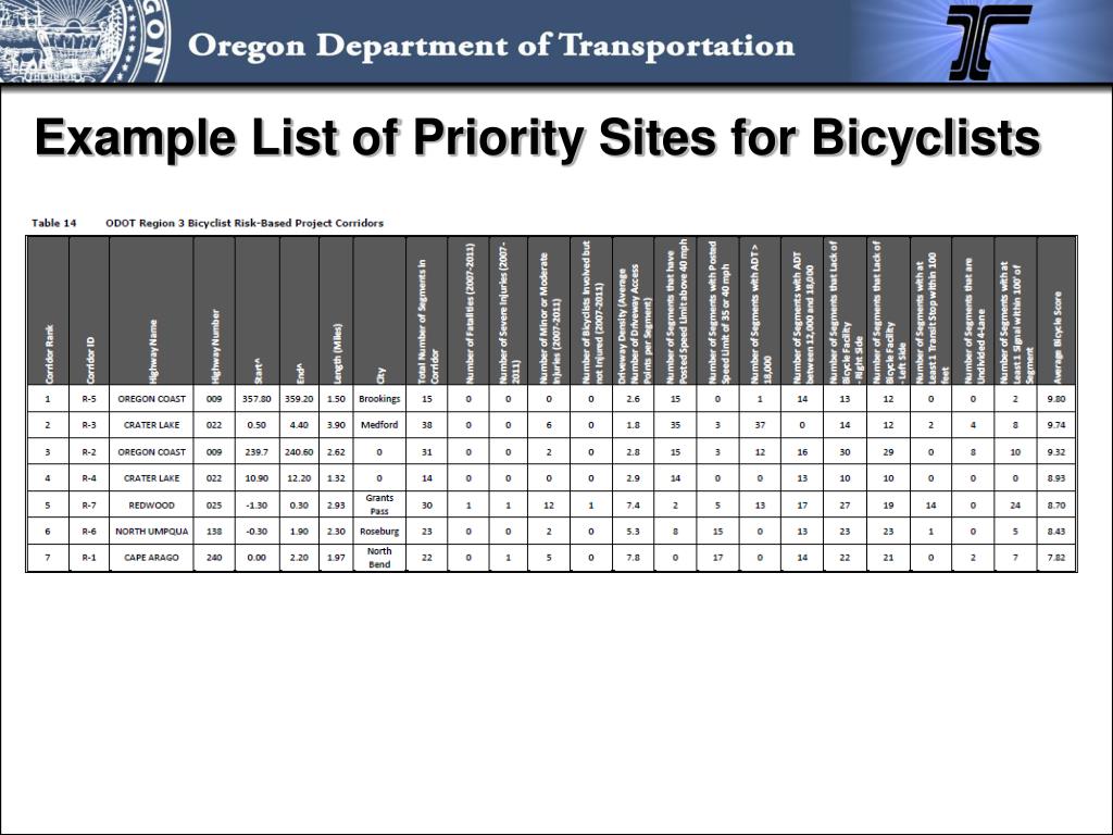 HSIP Funds for Pedestrian and Bicycle • Starting in 2017 • ODOT begins the All Roads Transportation Safety • Pedestrian and Bicycle funding at $4 Million per year • Each ODOT region will receive funds based on number of Ped/Bike F&A in the region • ODOT and local agencies will compete for the funds on an application basis • Applications with the highest score will receive funding • Scoring will be based on the risk based approach, i.e., those with highest risk based score