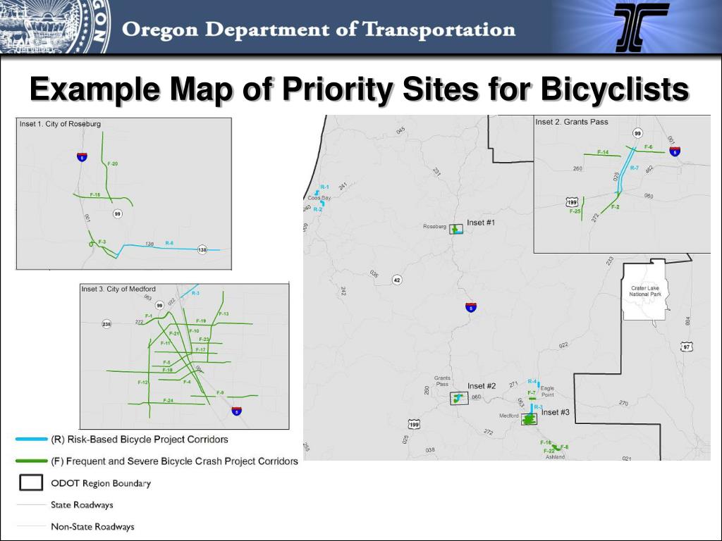 Pedestrian and Bicycle Safety • Three primary focus areas for Infrastructure Safety in the Oregon Transportation Safety Action Plan • Roadway Departure • Intersections • Pedestrian and Bicycles • ODOT has completed systemic plans identifying potential “sites with promise” for improving Roadway Departure and Intersections • Kittelson and Associates was hired to develop a Ped/Bike plan