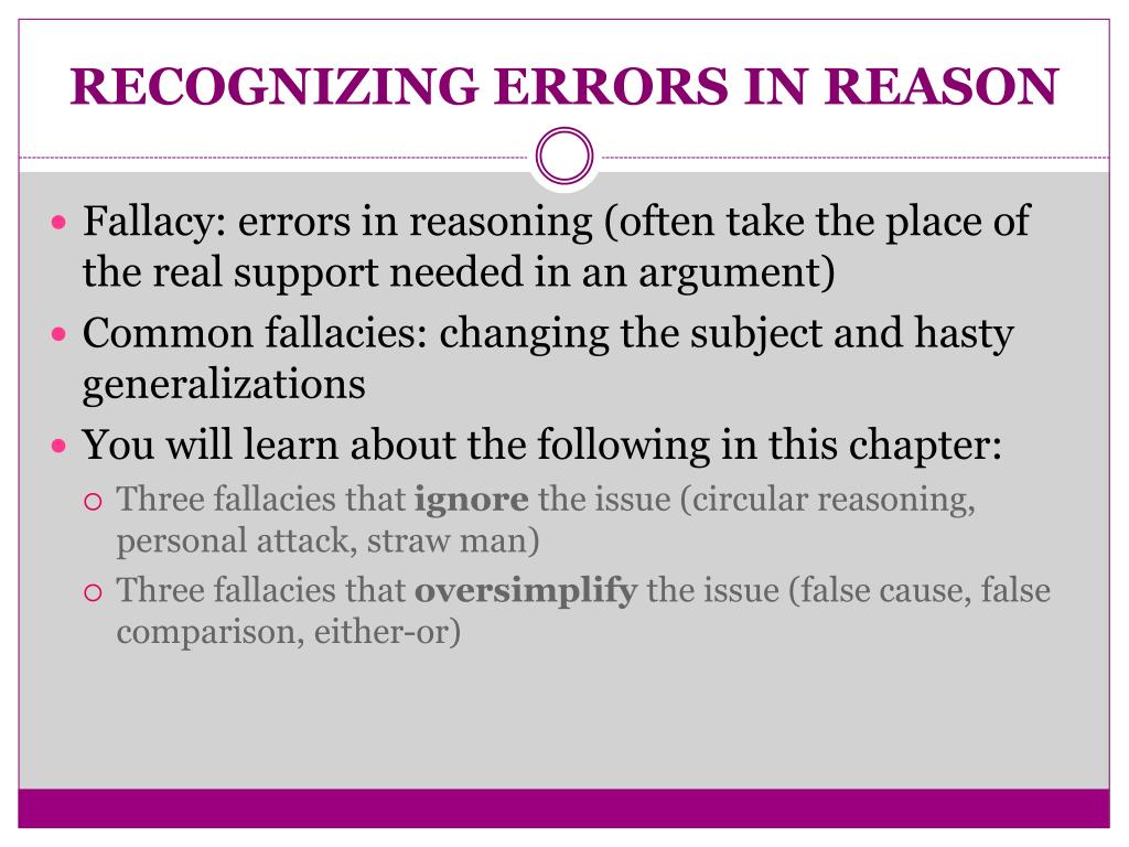 RECOGNIZING ERRORS IN REASON • Fallacy: errors in reasoning (often take the place of the real support needed in an argument) • Common fallacies: changing the subject and hasty generalizations • You will learn about the following in this chapter: • Three fallacies that ignore the issue (circular reasoning, personal attack, straw man) • Three fallacies that oversimplify the issue (false cause, false comparison, either-or)
