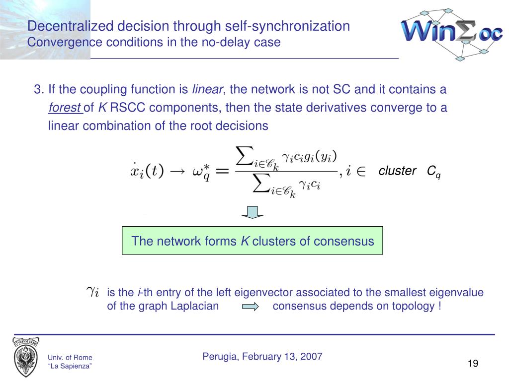 Decentralized decision through self-synchronizationConvergence conditions in the no-delay case 3. If the coupling function is linear, the network is not SC and it contains a forest of K RSCC components, then the state derivatives converge to a linear combination of the root decisions cluster Cq The network forms K clusters of consensus is the i-th entry of the left eigenvector associated to the smallest eigenvalue of the graph Laplacian consensus depends on topology ! Perugia, February 13, 2007