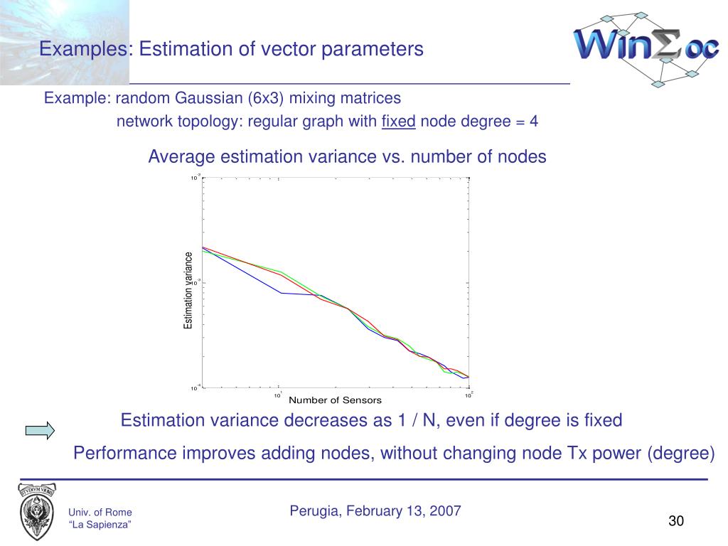 Examples: Estimation of vector parameters Example: random Gaussian (6x3) mixing matrices network topology: regular graph with fixed node degree = 4 Average estimation variance vs. number of nodes Estimation variance decreases as 1 / N, even if degree is fixed Performance improves adding nodes, without changing node Tx power (degree) Perugia, February 13, 2007