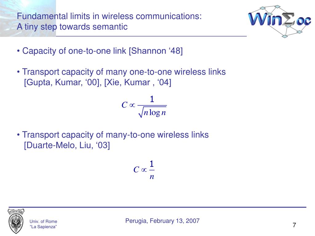Basic message: Efficient network design should take into account the goal of the network data-centric and event-driven approaches Fundamental limits in wireless communications: A tiny step towards semantic Besides providing bounds on transport capacity, fundamental scaling laws suggest also strategies to approach the bounds: • Spatial reuse / multihop • Distributed source / channel coding • In-network processing / computing • Hierarchical layering clustering Perugia, February 13, 2007