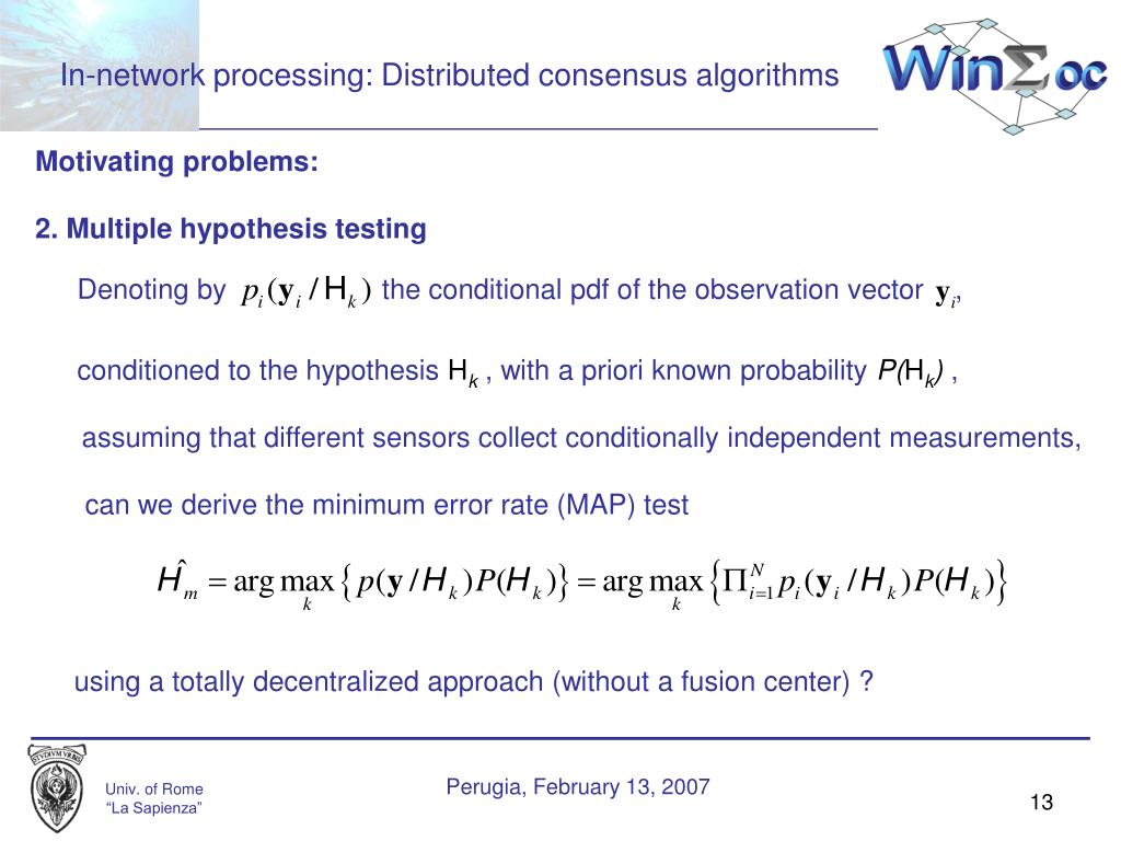In-network processing: Distributed consensus algorithms Motivating problems: 2. Multiple hypothesis testing Denoting by the conditional pdf of the observation vector , conditioned to the hypothesis Hk , with a priori known probability P(Hk) , assuming that different sensors collect conditionally independent measurements, can we derive the minimum error rate (MAP) test using a totally decentralized approach (without a fusion center) ? Perugia, February 13, 2007