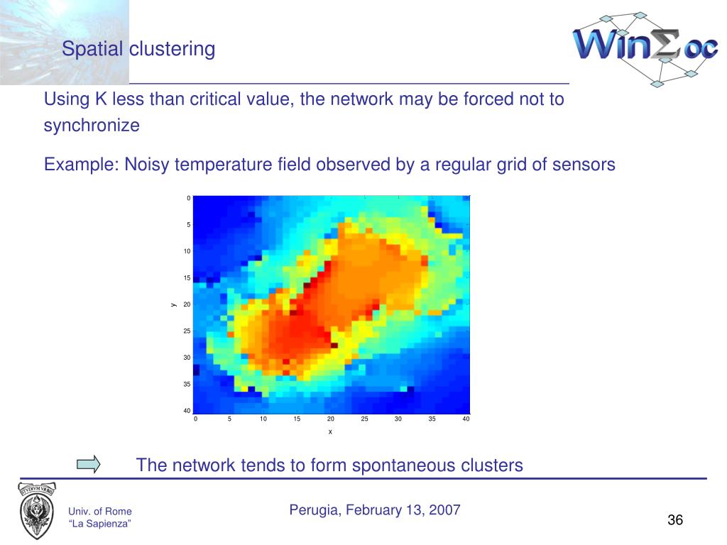 Spatial clustering Using K less than critical value, the network may be forced not to synchronize Example: Noisy temperature field observed by a regular grid of sensors The network tends to form spontaneous clusters Perugia, February 13, 2007