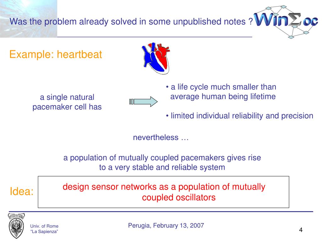 a life cycle much smaller than • average human being lifetime • limited individual reliability and precision design sensor networks as a population of mutually coupled oscillators Idea: Was the problem already solved in some unpublished notes ? Example: heartbeat a single natural pacemaker cell has nevertheless … a population of mutually coupled pacemakers gives rise to a very stable and reliable system Perugia, February 13, 2007
