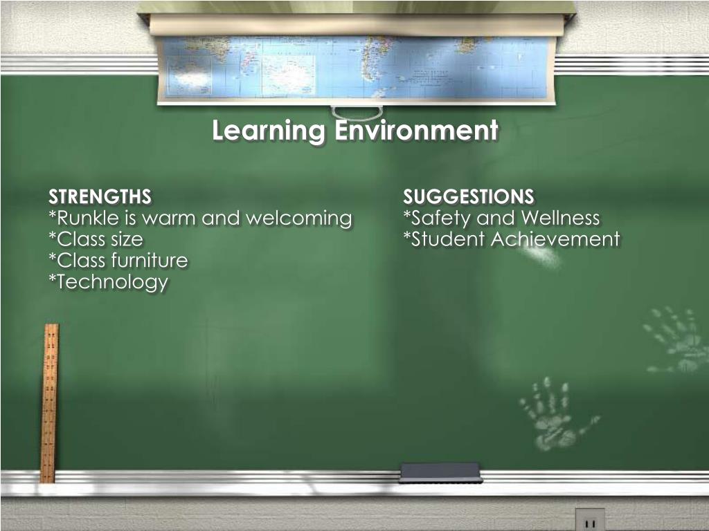Learning Environment STRENGTHS SUGGESTIONS *Runkle is warm and welcoming *Safety and Wellness *Class size *Student Achievement *Class furniture *Technology