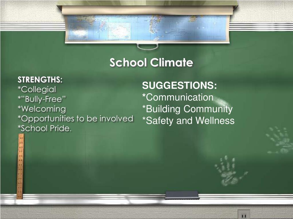 School Climate SUGGESTIONS: *Communication *Building Community *Safety and Wellness STRENGTHS: *Collegial *”Bully-Free” *Welcoming *Opportunities to be involved *School Pride.