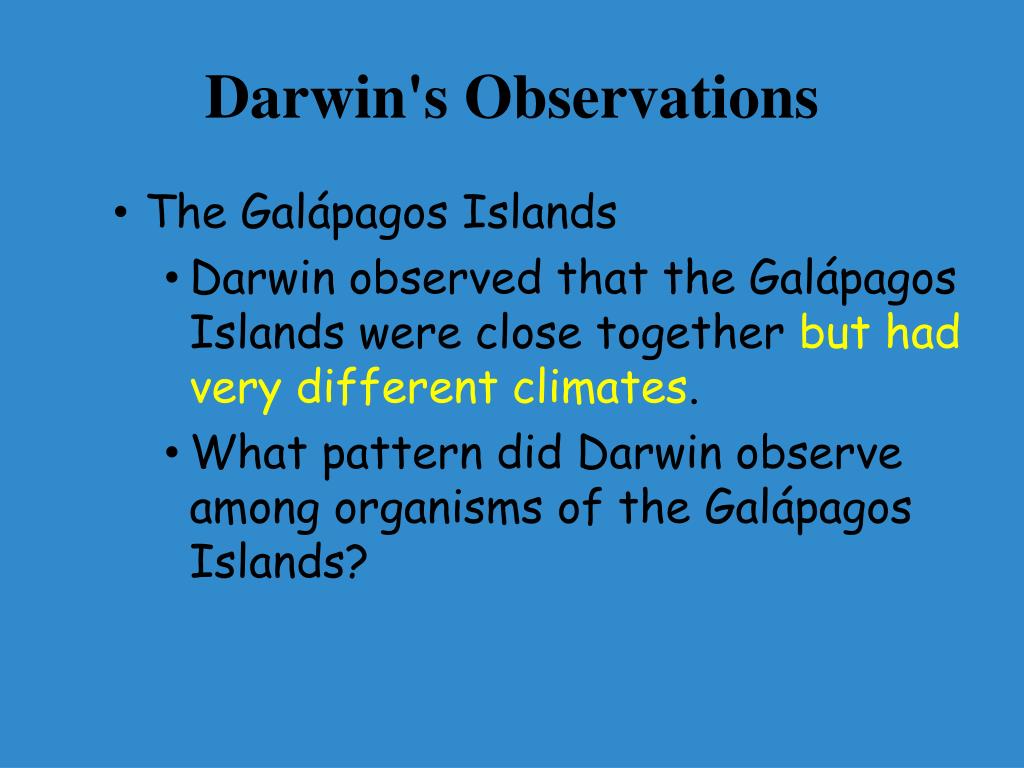 Darwin's Observations • The Galápagos Islands • Darwin observed that the Galápagos Islands were close together but had very different climates. • What pattern did Darwin observe among organisms of the Galápagos Islands?