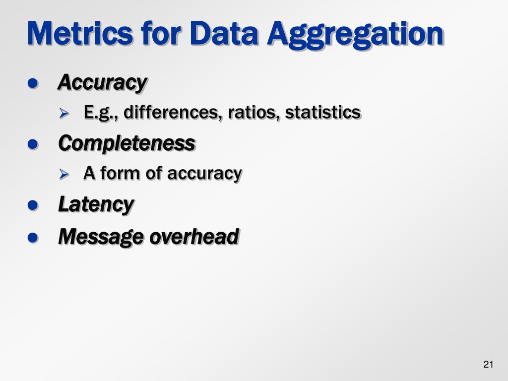 Metrics for Data Aggregation • Accuracy • E.g., differences, ratios, statistics • Completeness • A form of accuracy • Latency • Message overhead