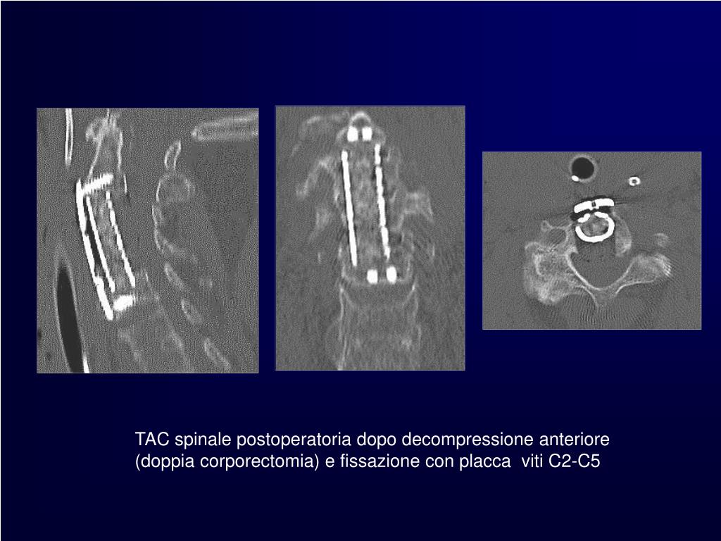 TAC spinale postoperatoria dopo decompressione anteriore (doppia corporectomia) e fissazione con placca viti C2-C5