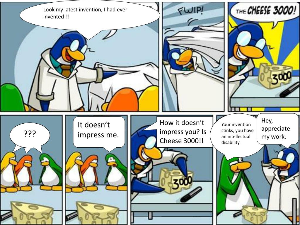 Look my latest invention, I had ever invented!!! Your invention stinks, you have an intellectual disability. Hey, appreciate my work. It doesn’t impress me. How it doesn’t impress you? Is Cheese 3000!! ??? ??? ???