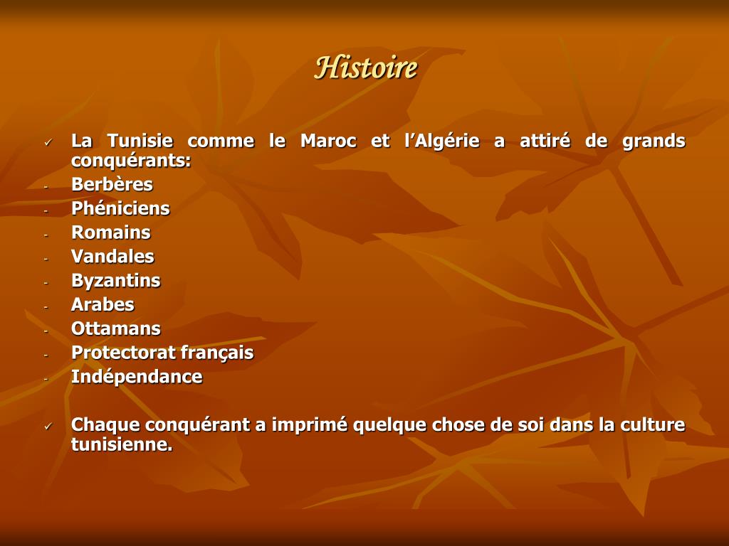 Histoire • La Tunisie comme le Maroc et l’Algérie a attiré de grands conquérants: • Berbères • Phéniciens • Romains • Vandales • Byzantins • Arabes • Ottamans • Protectorat français • Indépendance • Chaque conquérant a imprimé quelque chose de soi dans la culture tunisienne.