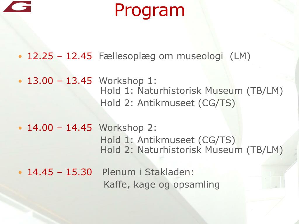 Program • 12.25 – 12.45 Fællesoplæg om museologi (LM) • 13.00 – 13.45 Workshop 1: Hold 1: Naturhistorisk Museum (TB/LM) Hold 2: Antikmuseet (CG/TS) • 14.00 – 14.45 Workshop 2: Hold 1: Antikmuseet (CG/TS) Hold 2: Naturhistorisk Museum (TB/LM) • 14.45 – 15.30 Plenum i Stakladen: Kaffe, kage og opsamling