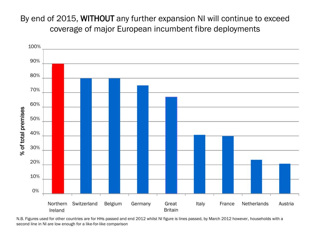 Currently Northern Ireland exceeds coverage of major European incumbent fibre deployments 100% 90% 80% 70% 60% % of total premises 50% 40% 30% 20% 10% 0% Northern Belgium Switzerland Germany France UK Netherlands Austria Italy Ireland N.B. Figures used for other countries are for HHs passed and end 2012 whilst NI figure is lines passed, by March 2012 however, households with a second line in NI are low enough for a like-for-like comparison