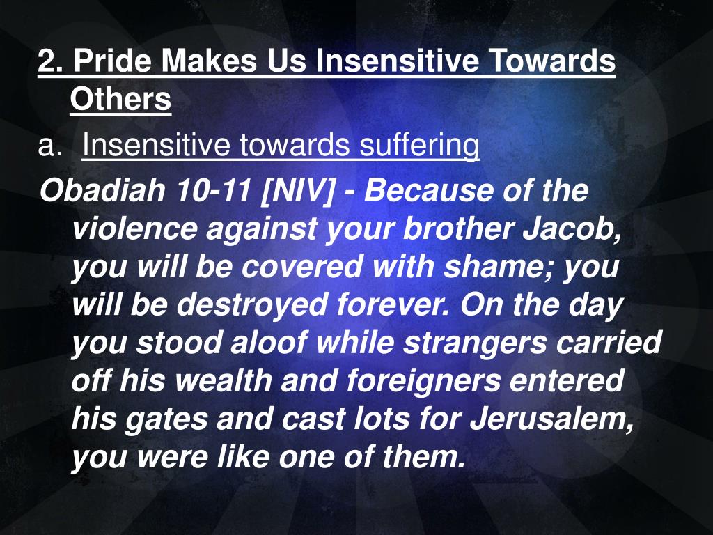 2. Pride Makes Us Insensitive Towards Others a. Insensitive towards suffering Obadiah 10-11 [NIV] - Because of the violence against your brother Jacob, you will be covered with shame; you will be destroyed forever. On the day you stood aloof while strangers carried off his wealth and foreigners entered his gates and cast lots for Jerusalem, you were like one of them.