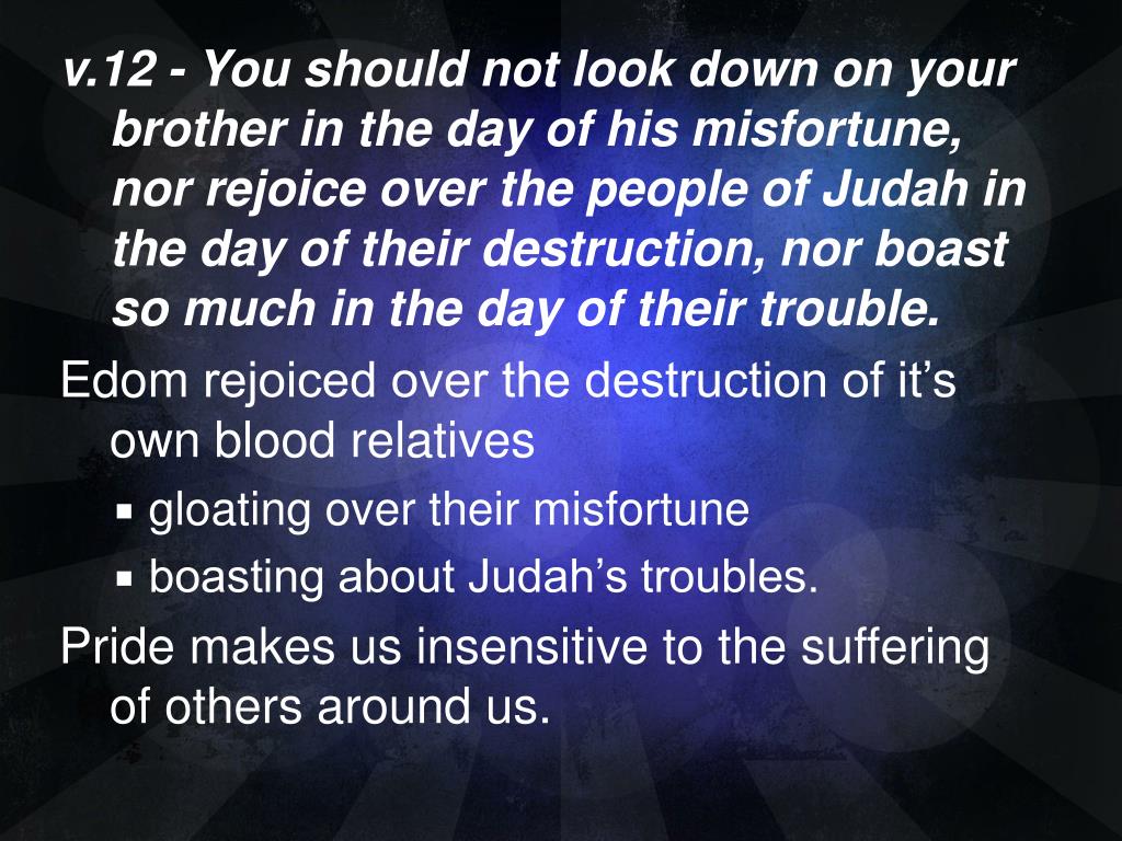 v.12 - You should not look down on your brother in the day of his misfortune, nor rejoice over the people of Judah in the day of their destruction, nor boast so muchin the day of their trouble. Edom rejoiced over the destruction of it’s own blood relatives • gloating over their misfortune • boasting about Judah’s troubles. Pride makes us insensitive to the suffering of others around us.