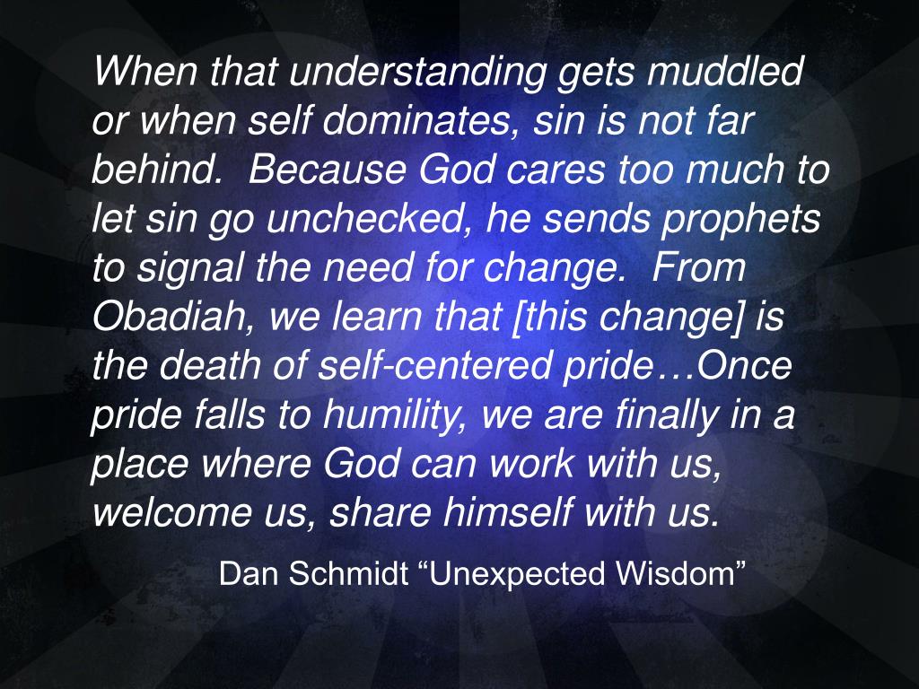 When that understanding gets muddled or when self dominates, sin is not far behind. Because God cares too much to let sin go unchecked, he sends prophets to signal the need for change. From Obadiah, we learn that [this change] is the death of self-centered pride…Once pride falls to humility, we are finally in a place where God can work with us, welcome us, share himself with us. Dan Schmidt “Unexpected Wisdom”