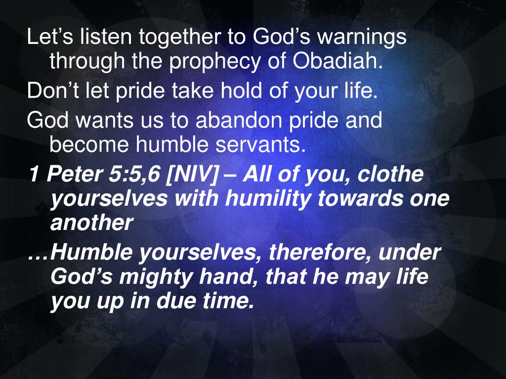 Let’s listen together to God’s warnings through the prophecy of Obadiah. Don’t let pride take hold of your life. God wants us to abandon pride and become humble servants. 1 Peter 5:5,6 [NIV] – All of you, clothe yourselves with humility towards one another …Humble yourselves, therefore, under God’s mighty hand, that he may life you up in due time.