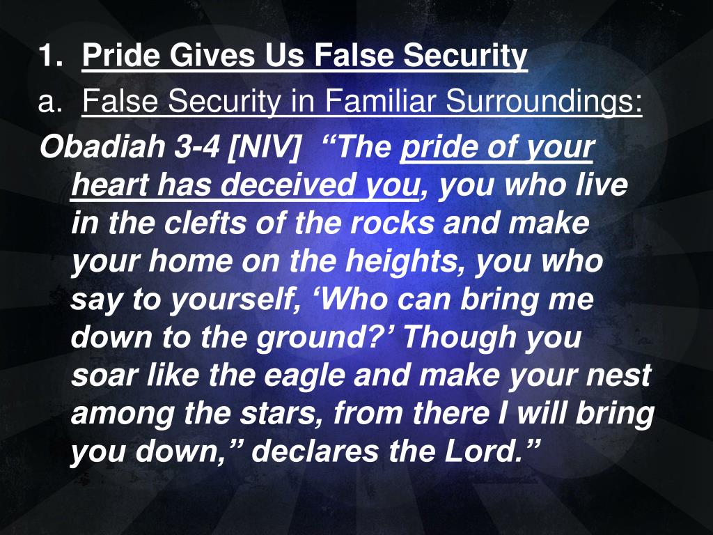 1. Pride Gives Us False Security a. False Security in Familiar Surroundings: Obadiah 3-4 [NIV] “The pride of your heart has deceived you, you who live in the clefts of the rocks and make your home on the heights, you who say to yourself, ‘Who can bring me down to the ground?’ Though you soar like the eagle and make your nest among the stars, from there I will bring you down,” declares the Lord.”
